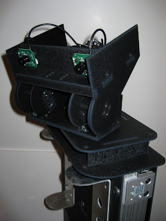 The head sported a pan/tilt, which used two AX-12s for tilting and a third for pan. It had two webcams for stereo, and was designed with enough space between the web cams to install a Videre short-range stereo camera, although I never got around to that: